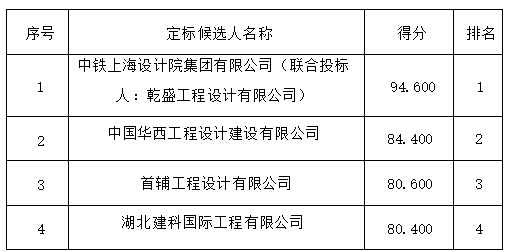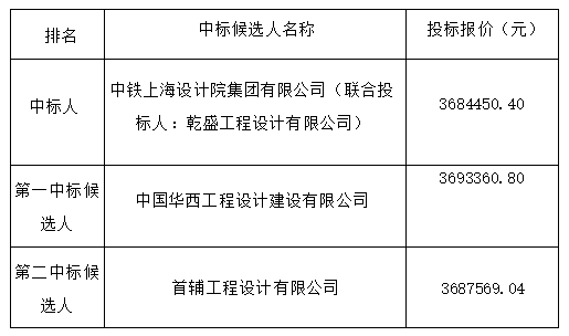 中标人 | 中铁上海设计院集团有限公司(联合投标人:乾盛工程设计有限公司) | |||||